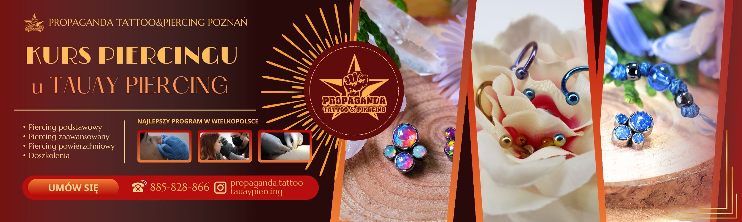 Na tej stronie zapoznasz się z naszą ofertą na szkolenia i kursy piercingu. Jeśli myślisz o rozpoczęciu kariery w branży i chcesz zapisać się na kurs piercingu, u nas znajdziesz pełne wsparcie, jasne informacje oraz przejrzysty cennik. Sprawdź ofertę i przekonaj się, dlaczego Propaganda od lat pozostaje jednym z najbardziej rozpoznawalnych i przede wszystkim jakościowych salonów piercingu w Poznaniu i całej Wielkopolsce. Zachęcamy do zapoznania się z całym naszym materiałem, ponieważ rozwieje on wszelkie ewentualne wątpliwości odnośnie szkolenia z piercingu.